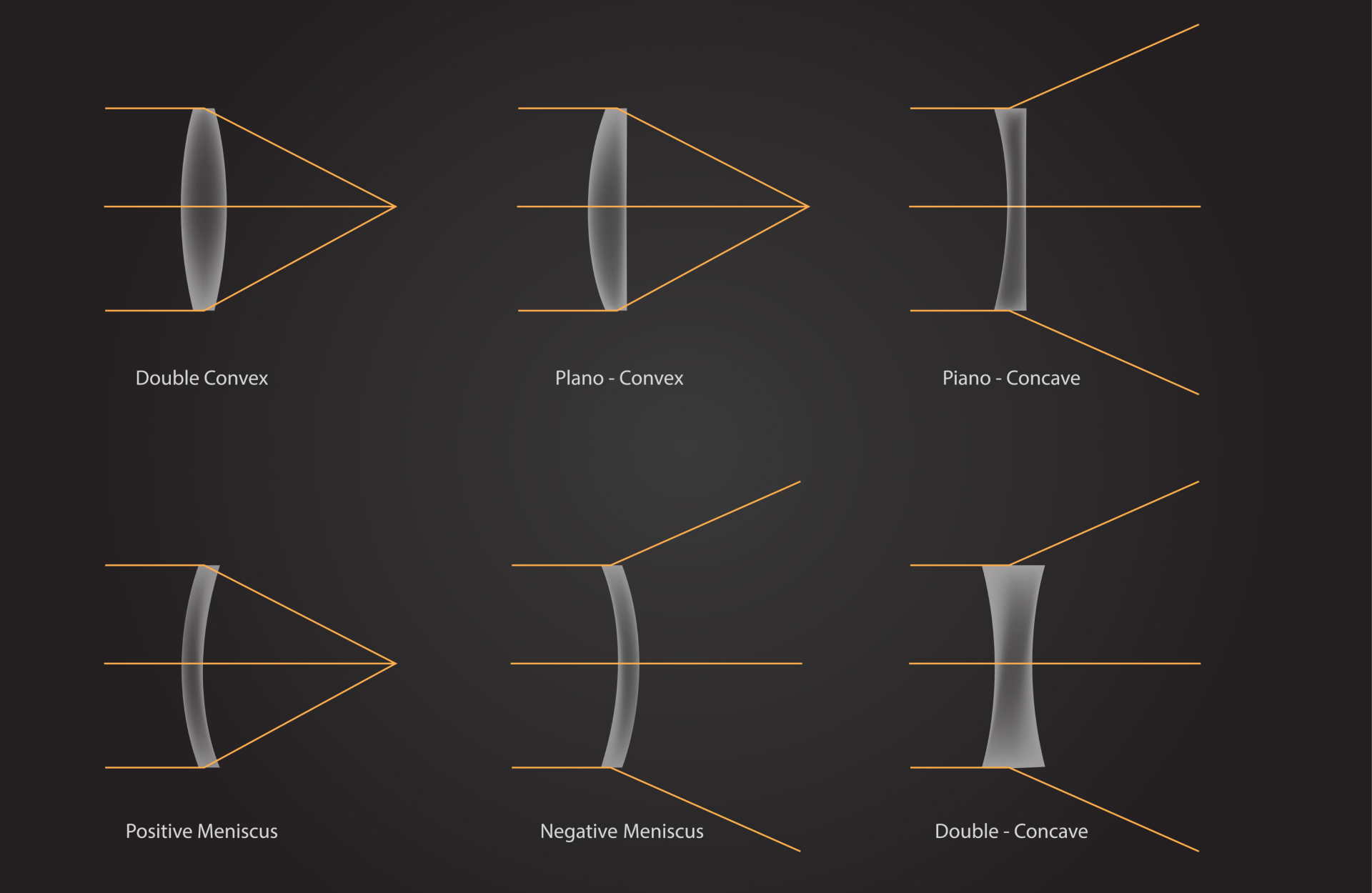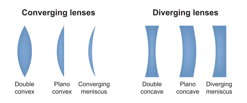 - spherical plano convex - spherical plano concave - spherical double convex - spherical double concave - cylindrical plano convex - cylindrical plano concave - meniscus