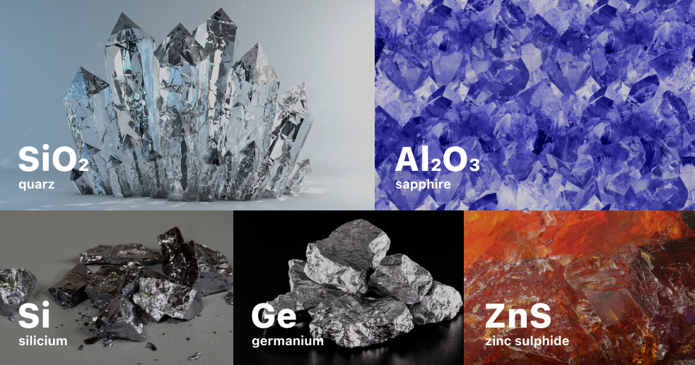 We deal with materials transparent within broad transmission bands from ultraviolet to far infrared, starting from UV Fused Silica to Sapphire, Ge, Si, ZnS, ZnSe as Infrared materials.